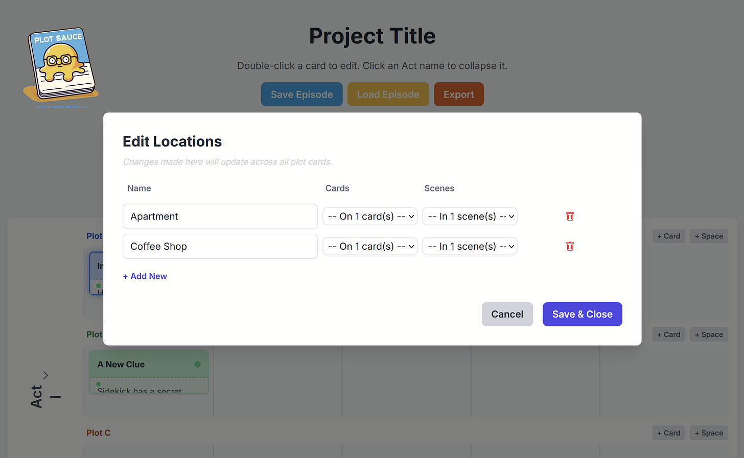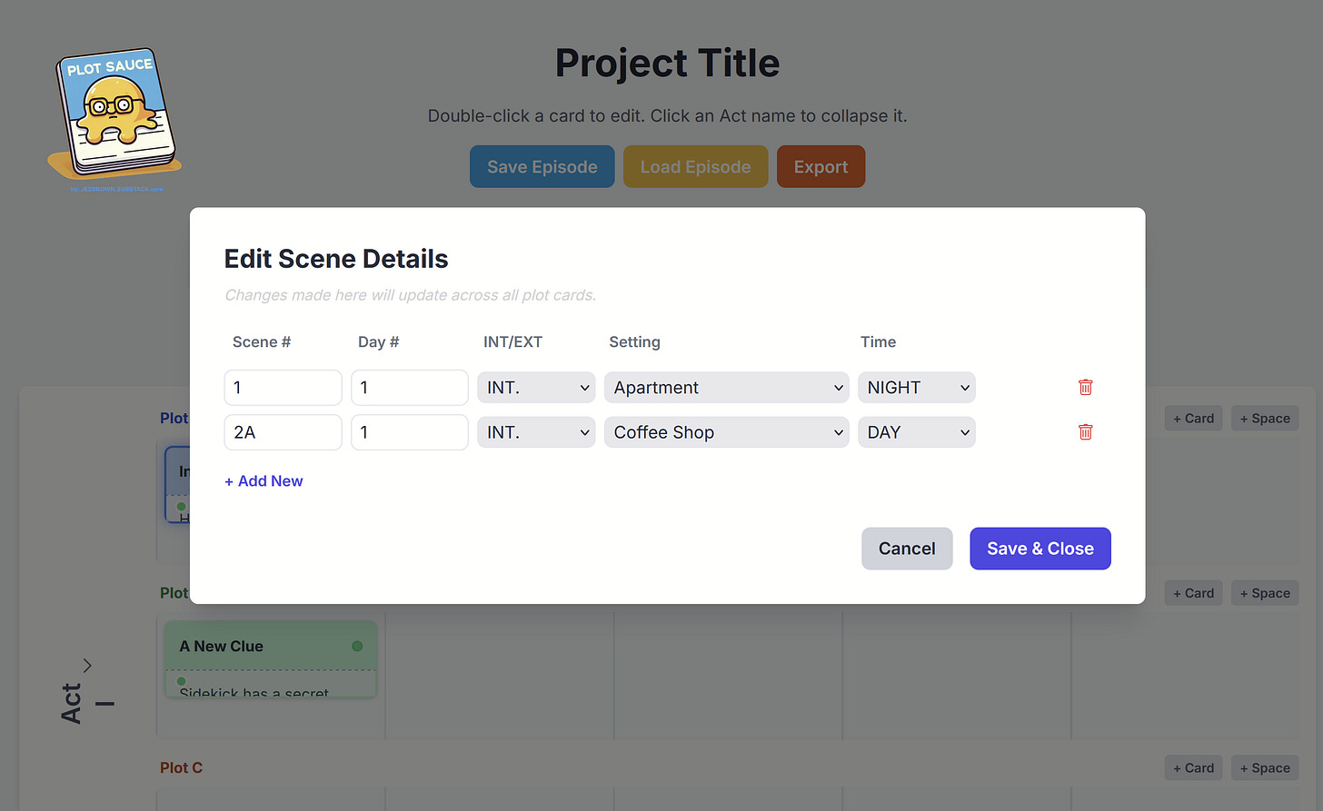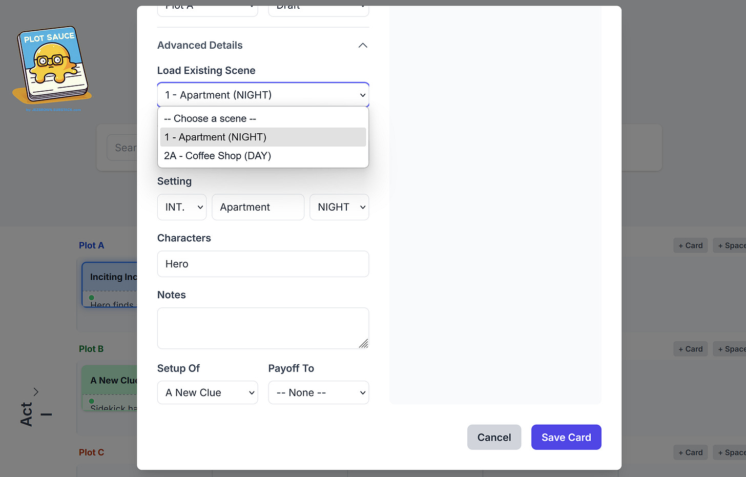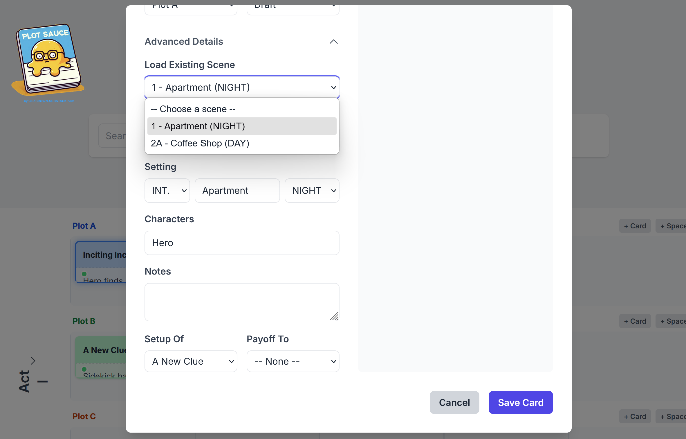 Then auto-populate your plot card’s scene details from the drop down menu.