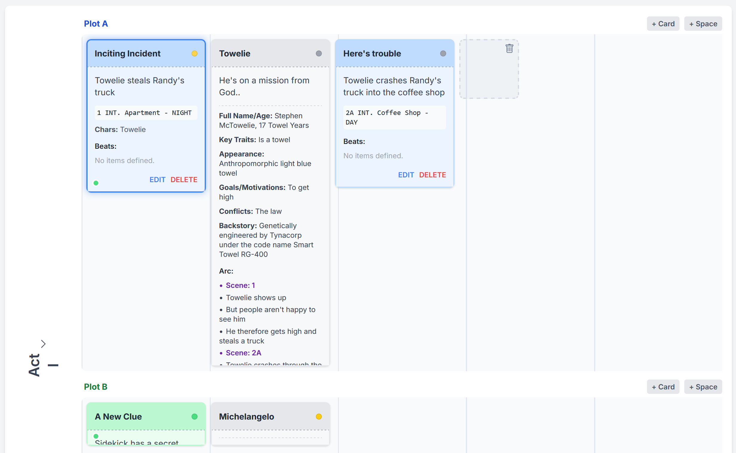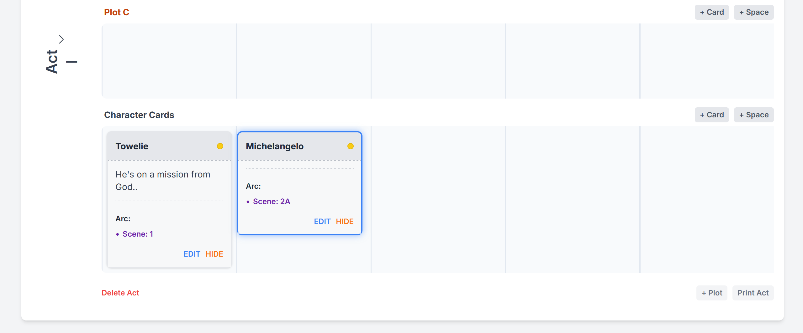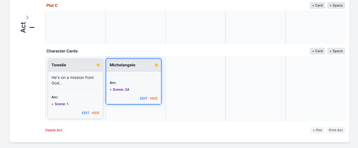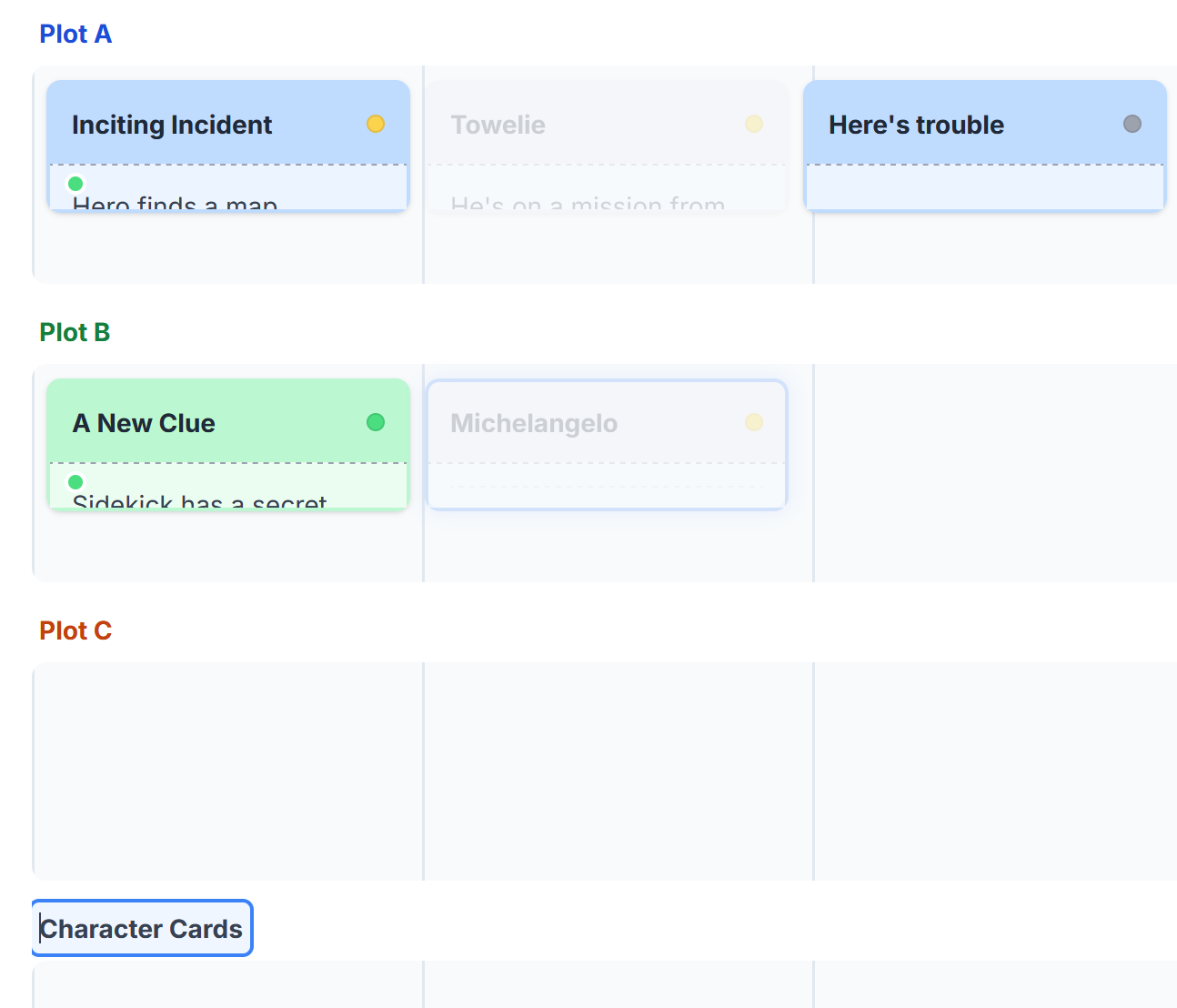 Character Cards can be found under your plot timelines and can be placed anywhere on your boards depending on how you like to work.