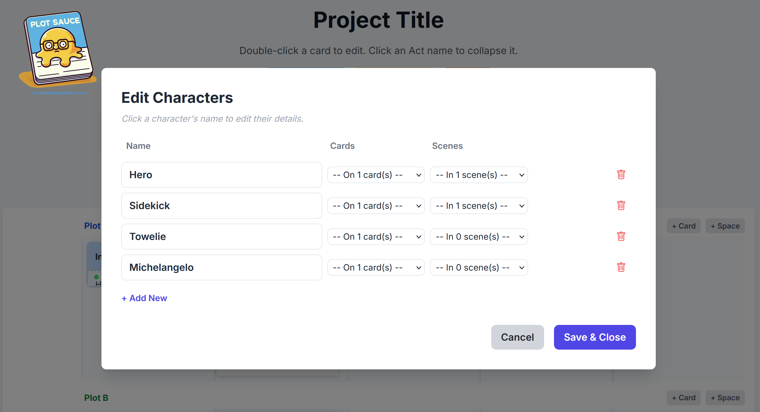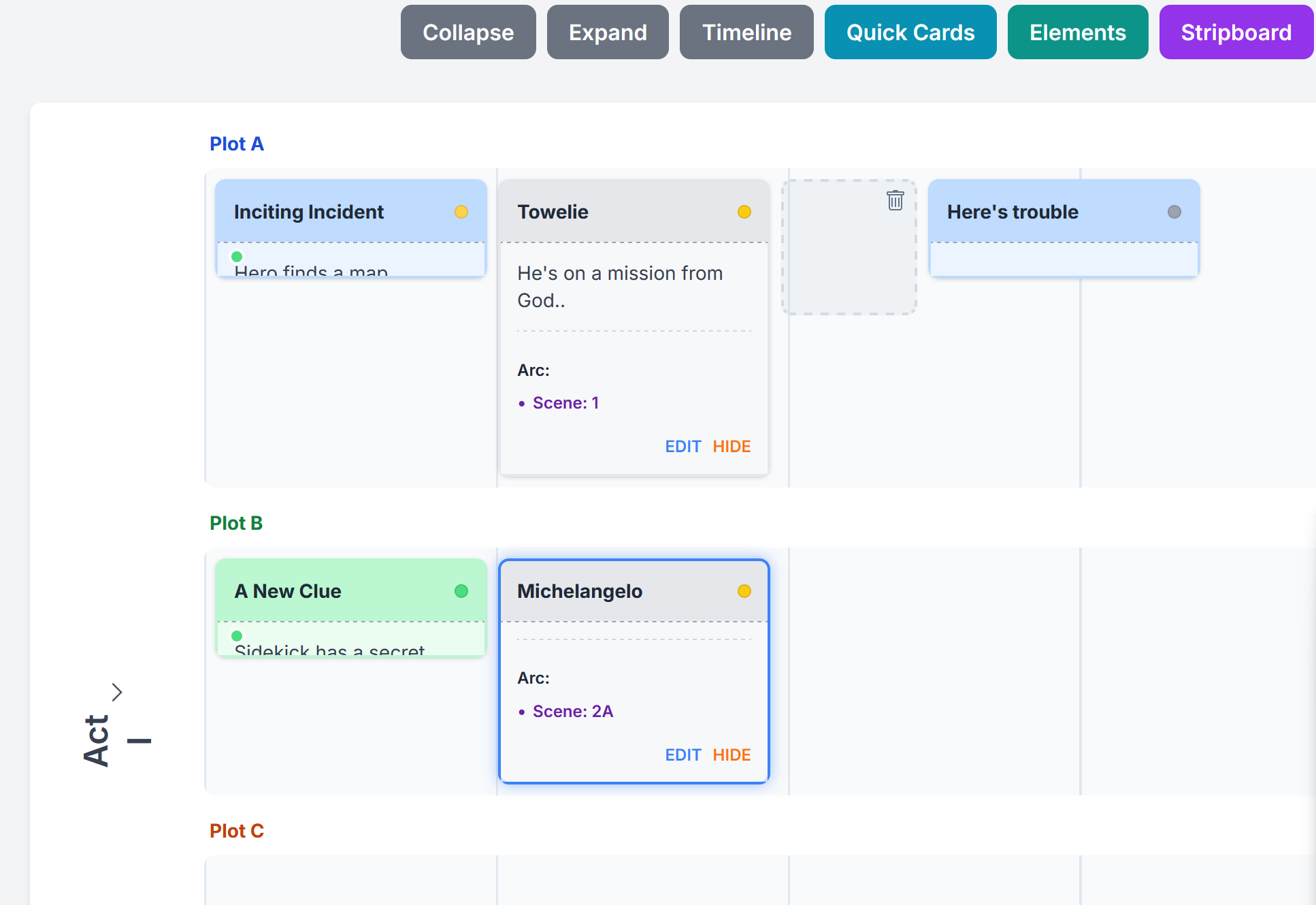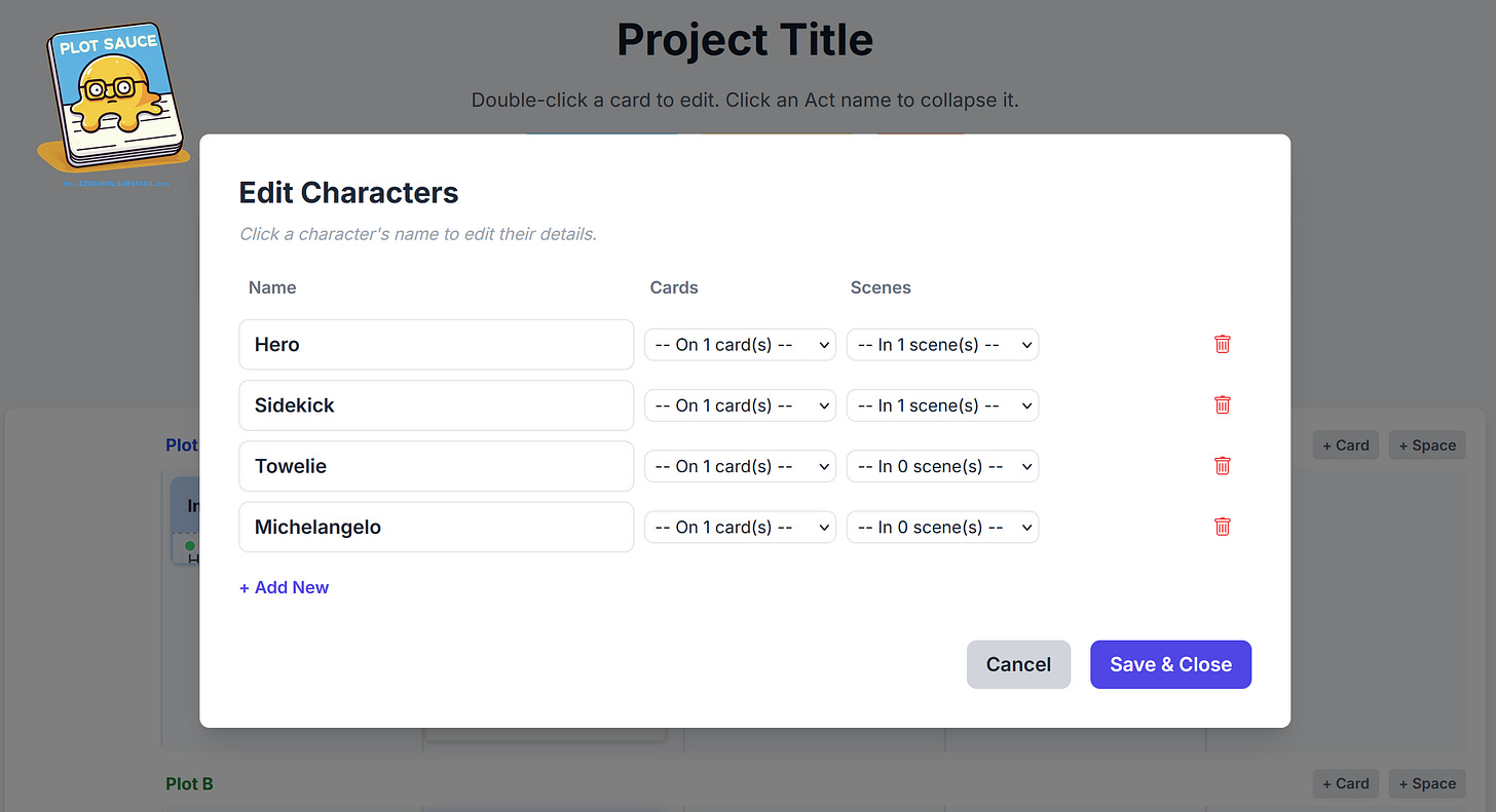 Character Cards can be found under your plot timelines and can be placed anywhere on your boards depending on how you like to work.