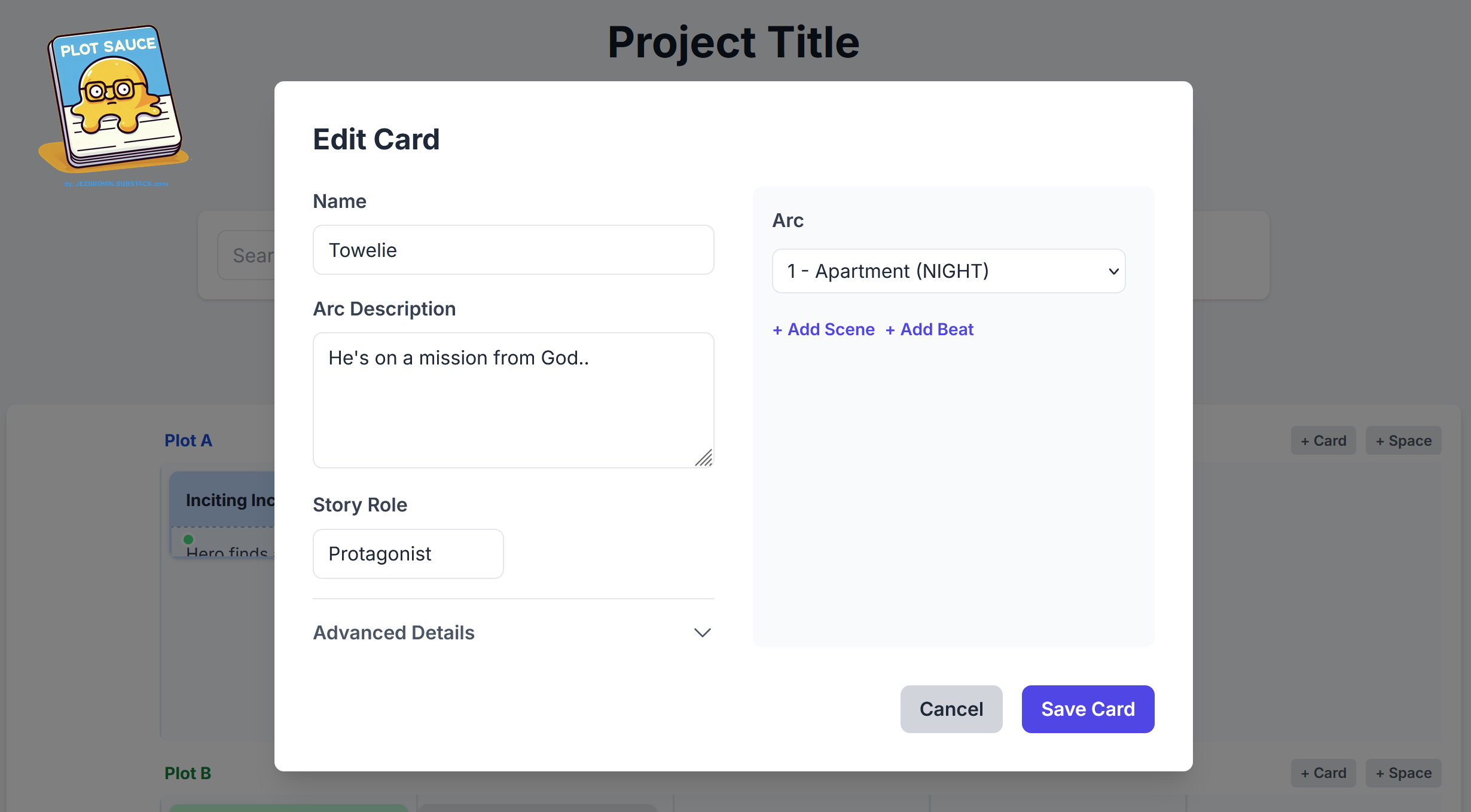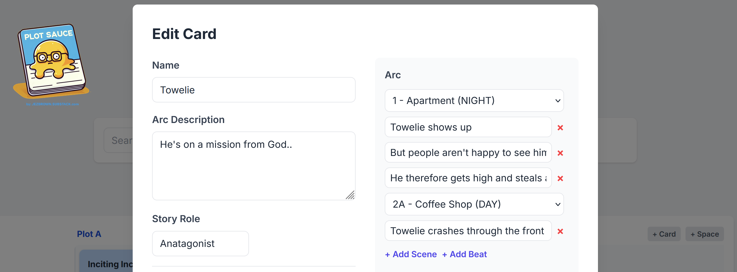 These arc scenes won’t tally against a character in the Elements Edit Menus. Only once your character is added to plot cards will it show the scenes you’ve actually put them in.
